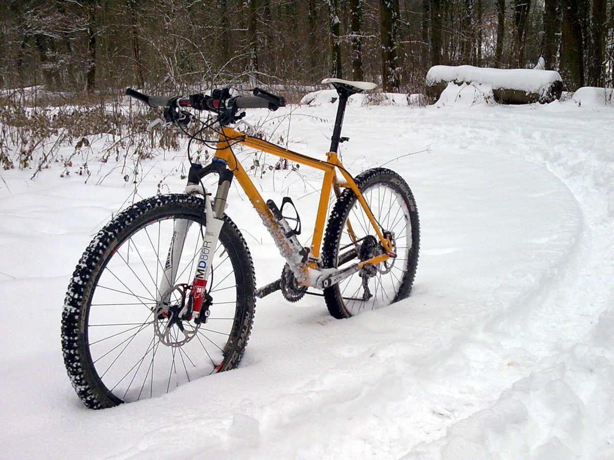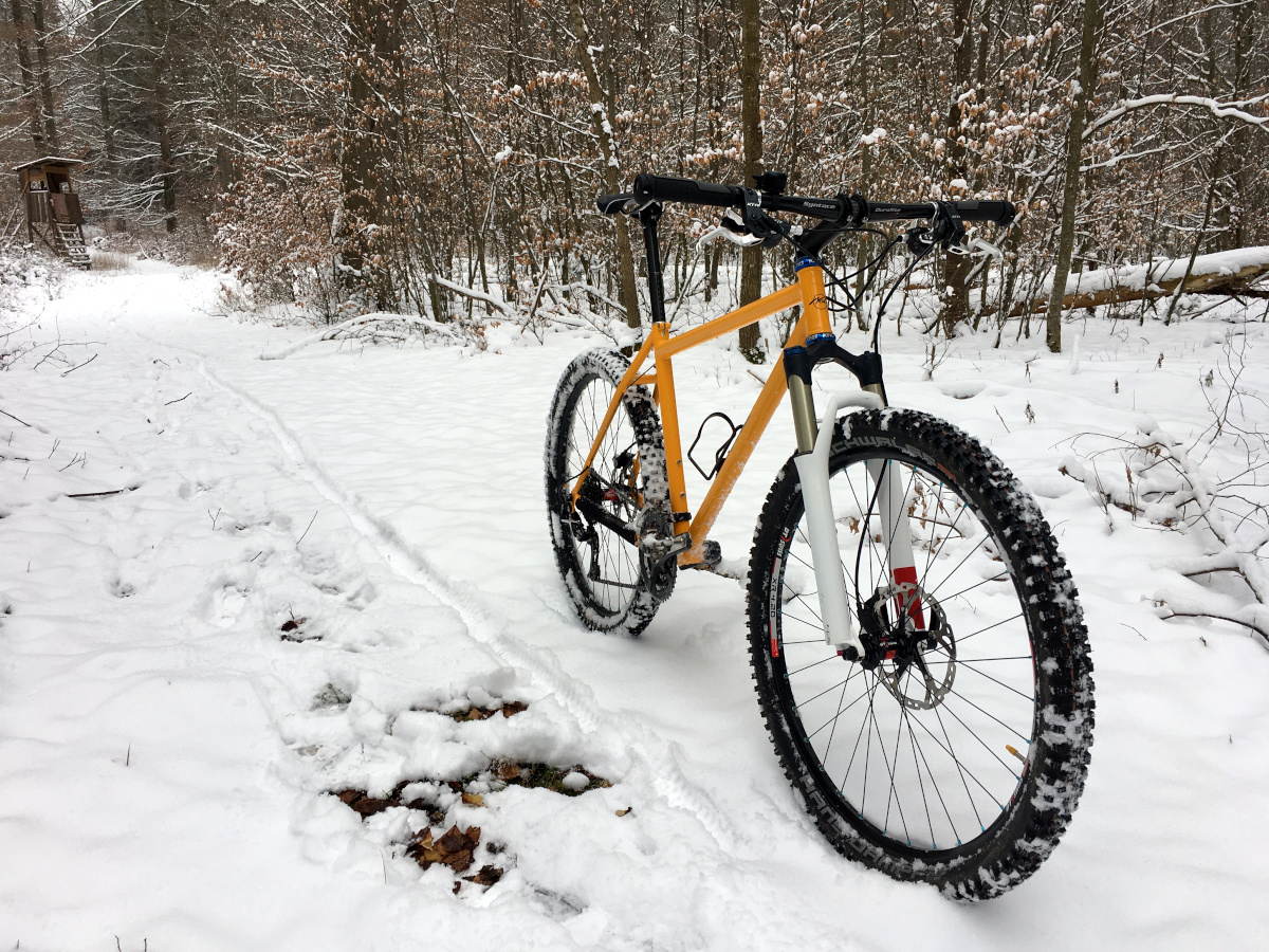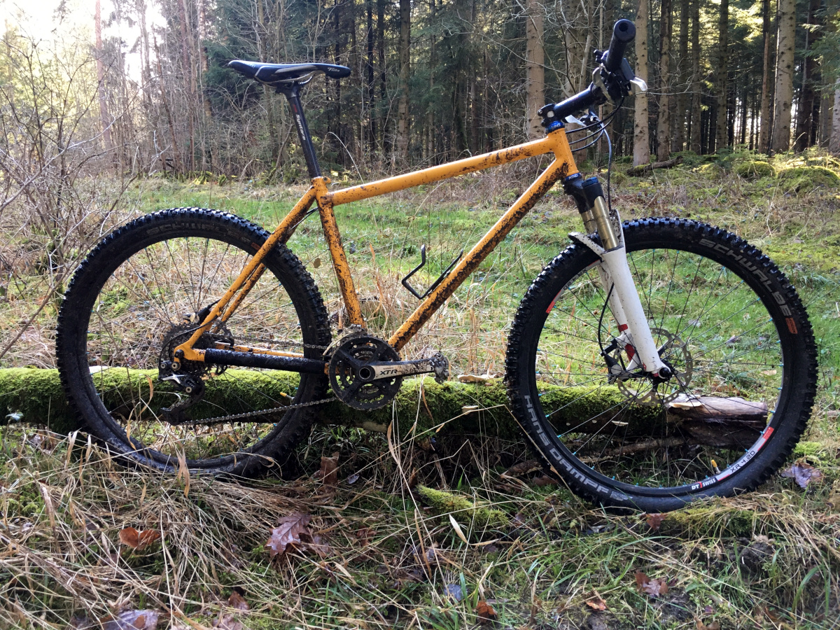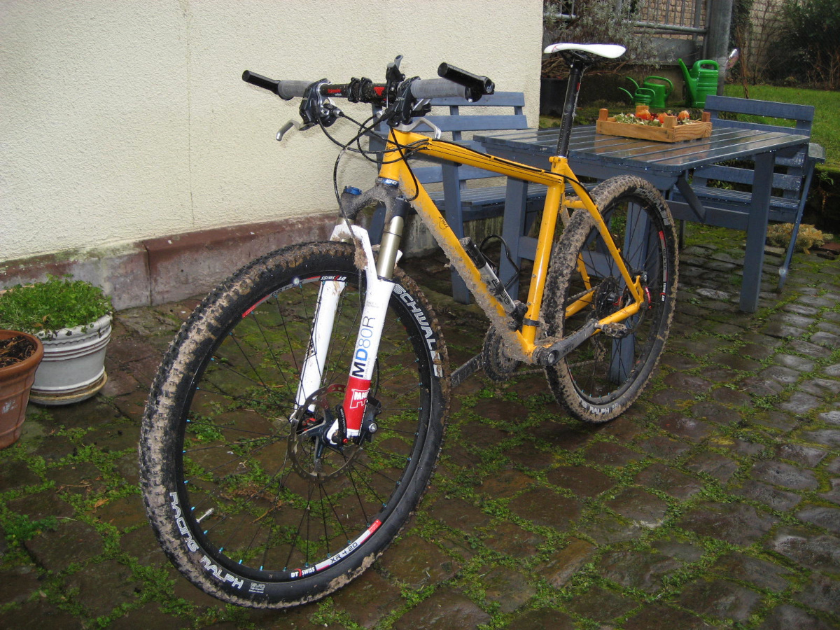 Weil ich das Rad nun fast nur noch im Winter einsetze, habe ich recht grobstollige Reifen aufgezogen (Schwalbe Hans Dampf). Das ist toll bei Schnee und Matsch, nimmt dem Bike aber leider etwas von seiner Spritzigkeit. Für den Sommer habe ich zwar irgendwo noch einen Satz Rocket Ron herumliegen. Aber in den warmen Jahreszeiten fahre ich ja doch eher Fully oder Rennrad. Na ja, und um mal ganz ehrlich zu sein: Der Lenker ist doch etwas schmal für heutige Geschmäcker und der Federweg von 80 Millimetern ist auch nicht gerade State of the Art. Im Großen und Ganzen ist mein zweites Nöll also inzwischen auch eher ein Retro-Bike. Aber ich liebe es.