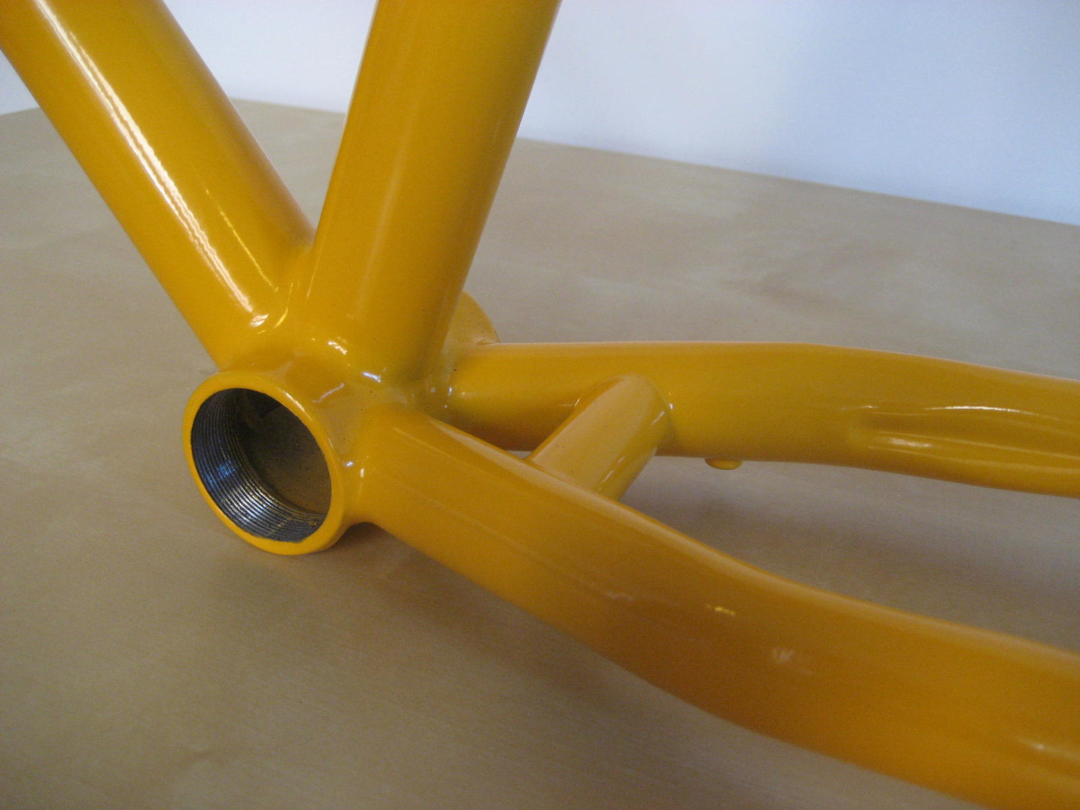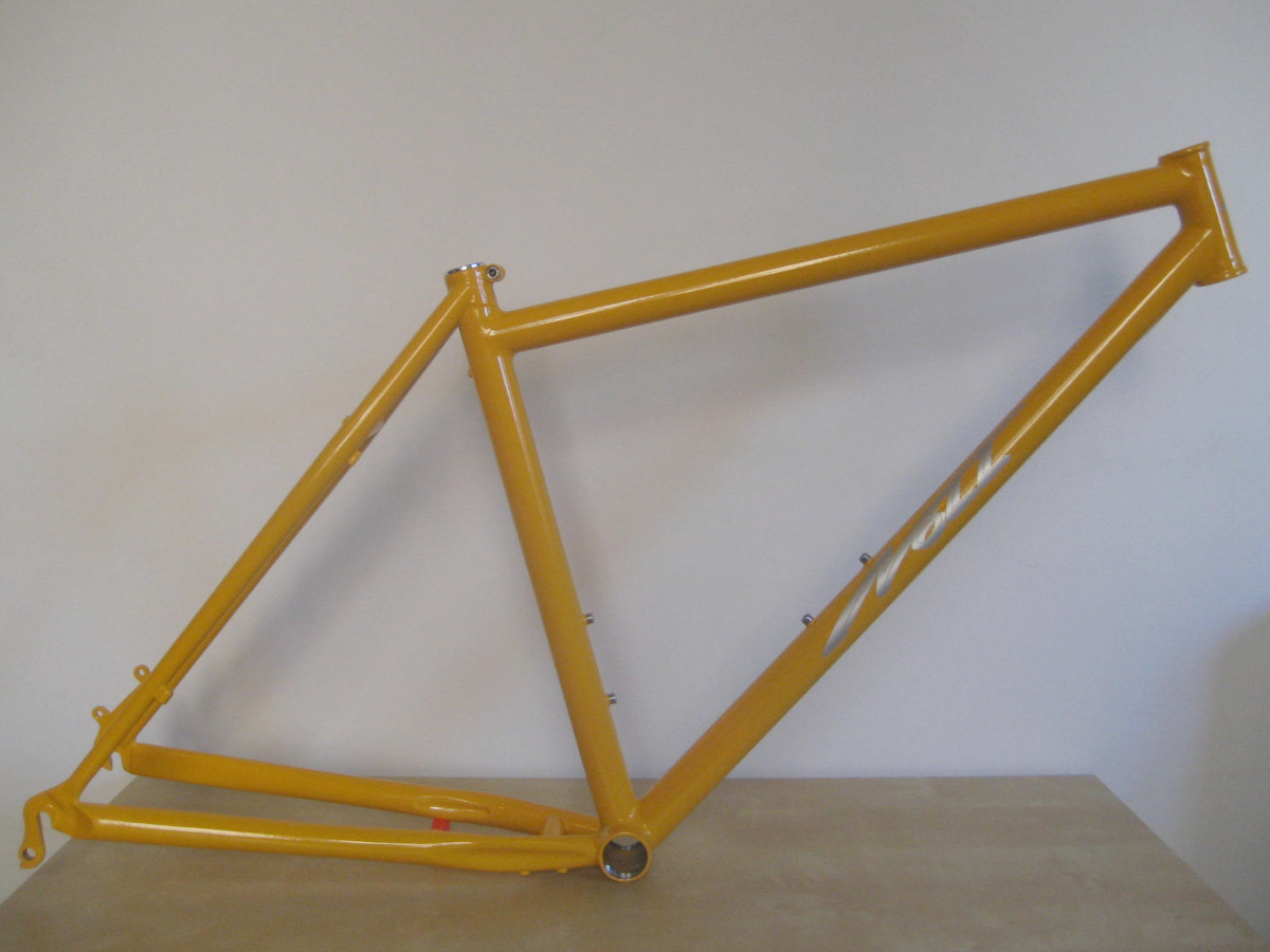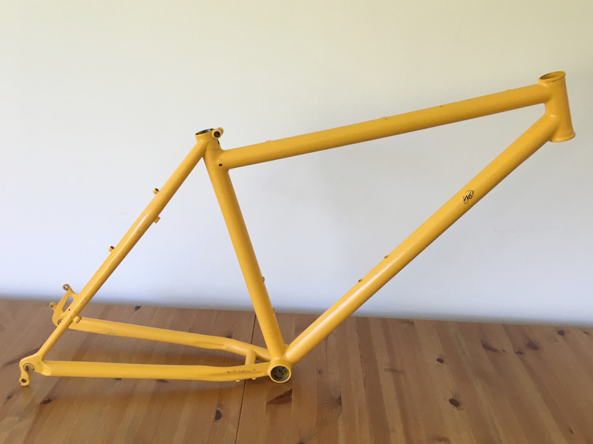 Ich bin ein bisschen selbst Schuld daran. Als der Rahmen neu war, also 2008, gab es ein Problem mit der Scheibenbremsaufnahme. Sie war falsch angelötet, vermutlich für einen kleineren Scheibendurchmesser. Das Rad musste noch mal zurück zu Nöll, wurde entlackt, umgelötet und wieder neu pulverbeschichtet. Ein winziger Lackfehler war beim zweiten Mal durch die Qualitätssicherung gerutscht. Es war nur ein ganz kleiner Fleck am Oberrohr. Ich hatte einfach keine Nervern mehr, den Rahmen ein zweites Mal zurückgehen zu lassen; ich wollt endlich damit fahren. Also hatte ich damals es so gelassen, wie es war.