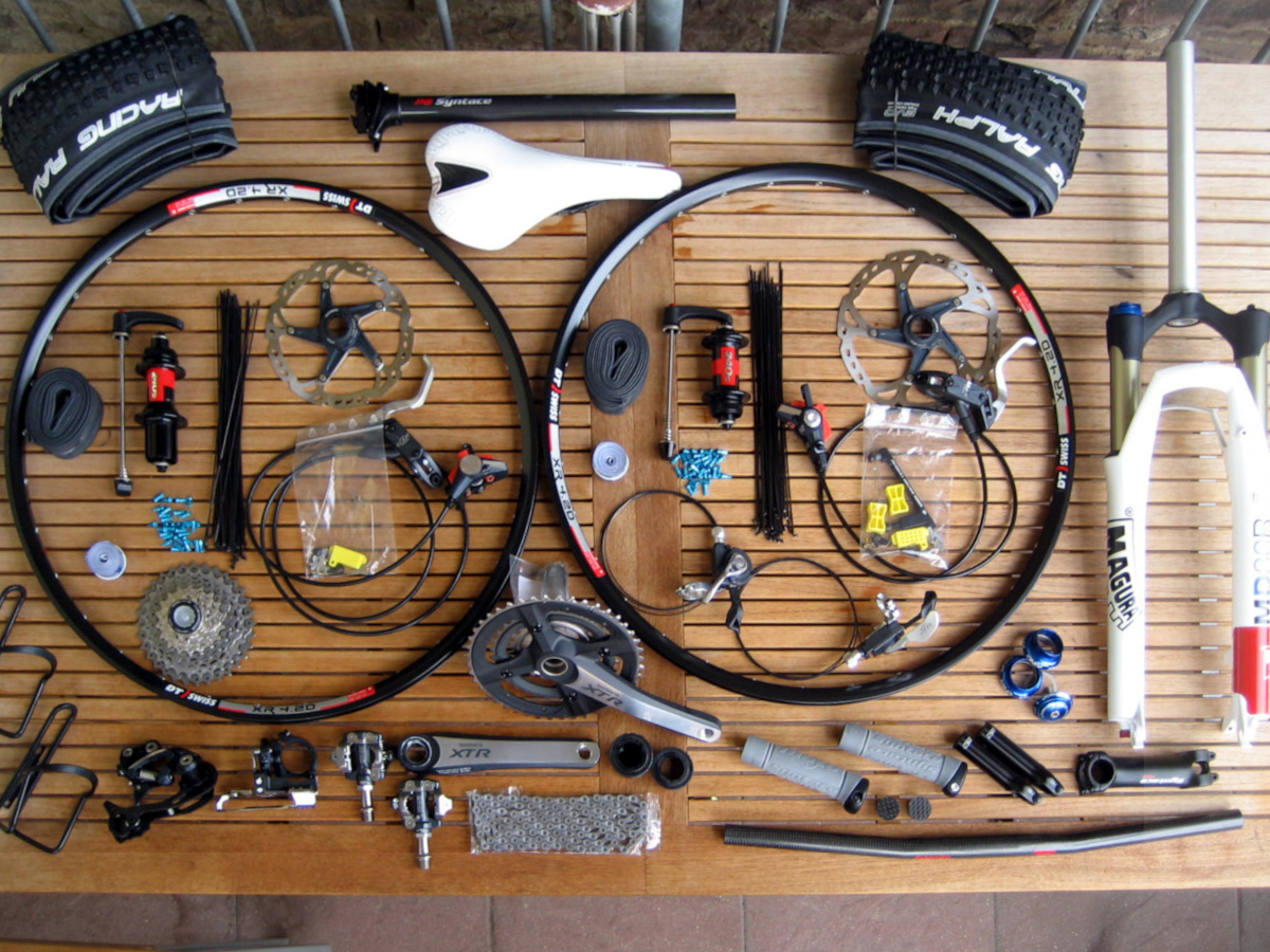 Ein kleines Verschleißteil-Sortiment habe ich mir mal noch ins Regal gelegt. Es besteht aus Schaltzügen, Bremsleitungen, Bremsbelägen, ein paar 9-fach-Ketten, einem XT-Ritzelpaket und kürzlich habe ich sogar noch ein Original-Innenlager und drei XTR-Kettenblätter auftreiben können. Die sind zwar nicht nagelneu, aber noch fast neuwertig.