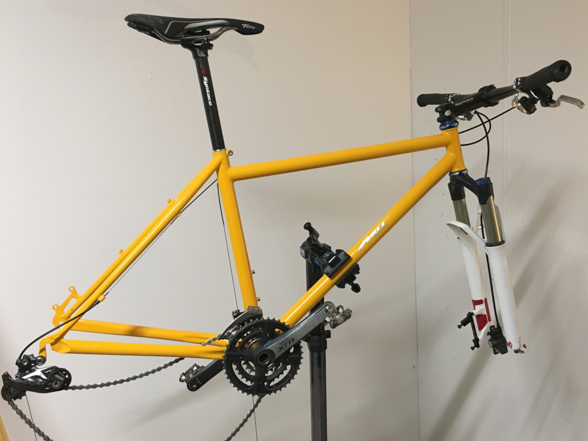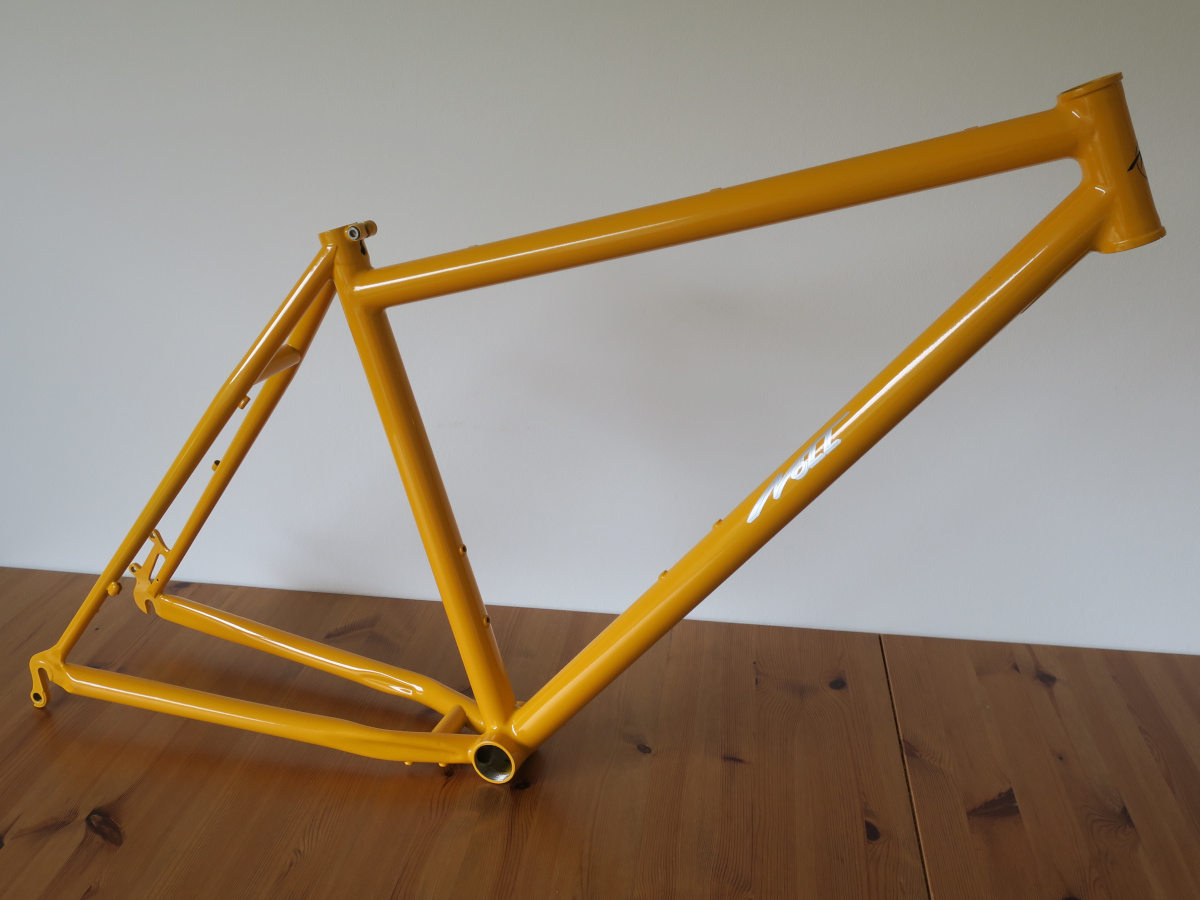 Nach einem Fehlversuch bei der Konkurrenz habe ich mich für ein maßgeschneidertes Nöll M5 Space entschieden. Handgefertig aus 34CrMo4-Stahl, muffenlos gelötet, die technologische Spitze des Stahlrahmenbaus. Mehr Stabilität bei gerade noch akzeptablem Rahmengewicht kann man für Geld wahrscheinlich nicht bekommen.