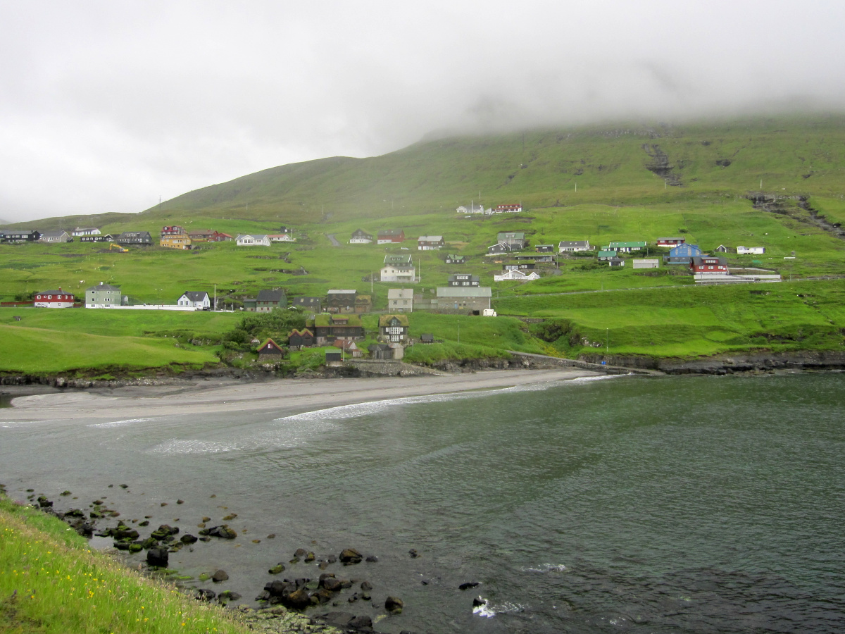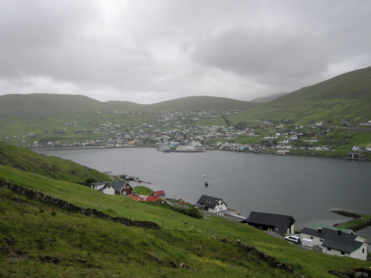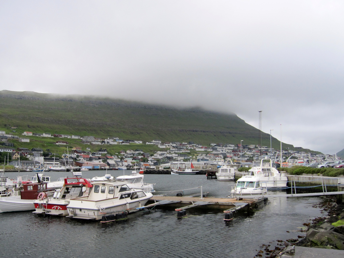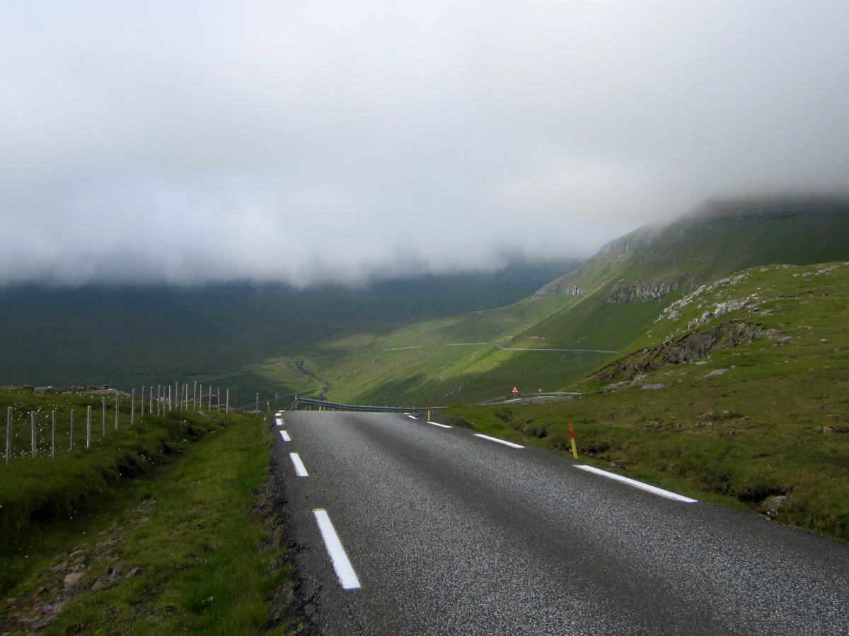 Für die Fahrt nach Tórshavn nehme ich aus Zeit- und Motivationsmangel den Bus. Dort ist das Wetter wieder richtig schön. Am nächsten Tag soll es jedoch schon wieder regnen, und so werde ich wohl auf den Reiseführer hören, der von einer Fahrt über die alte Bergstraße in Richtung Vestmanna bei Wolken abrät. Da ich sie trotzdem gern fahren will, beschließe ich, heute von Tórshavn aus einen Ausflug auf diese Straße zu machen, um die Aussicht auf Hestur und Koltur zu bestaunen. Aber selbst dieser Versuch endet im Nebel. Ich kehre um nach Tórshavn, schaue mir abends im Irish Pub das Finale der Fußball-WM an und muss danach mein Zelt zwischen hunderten Touristen suchen, die mit der Islandfähre angekommen sind.
