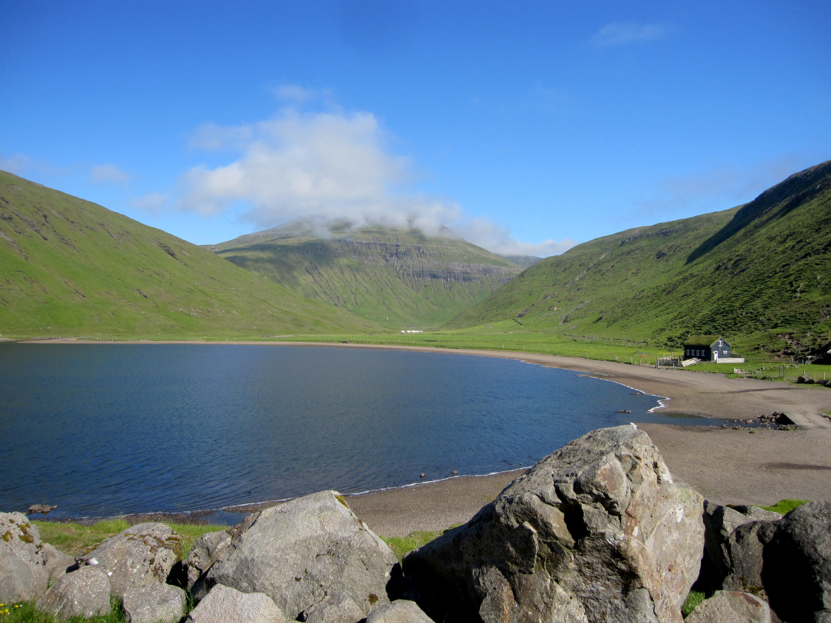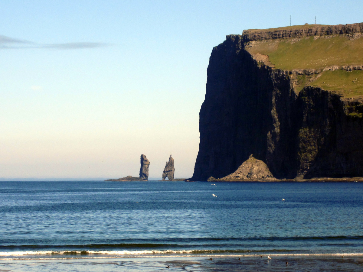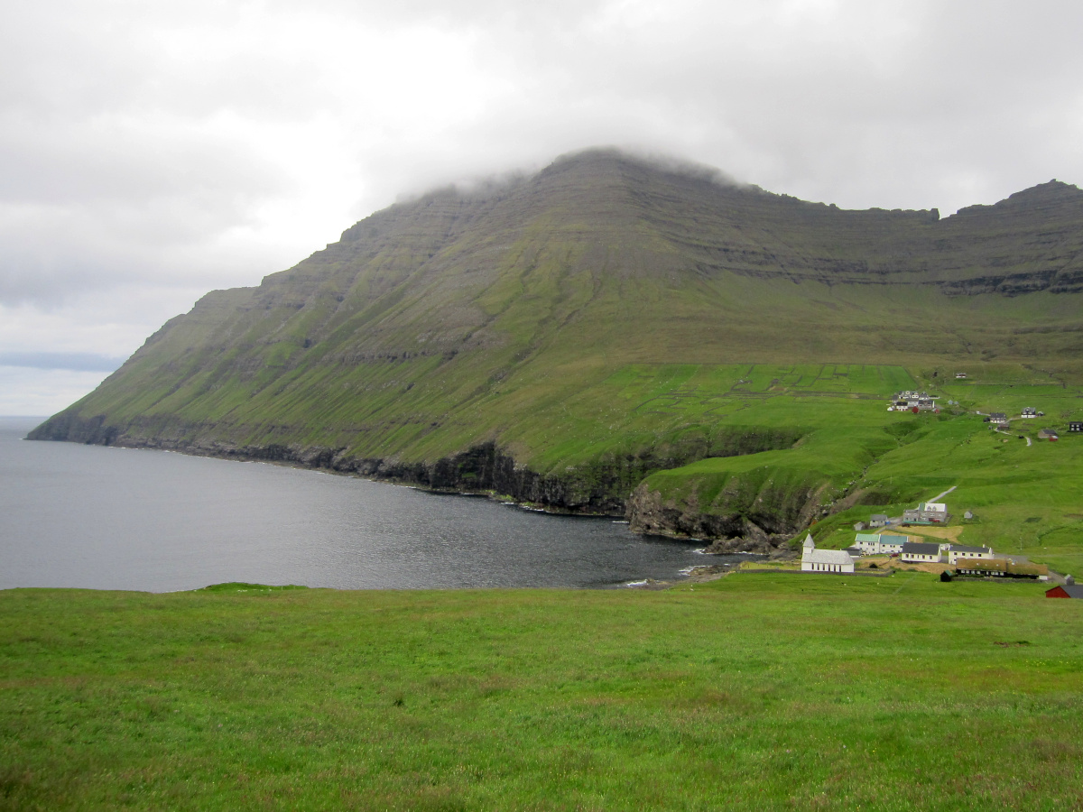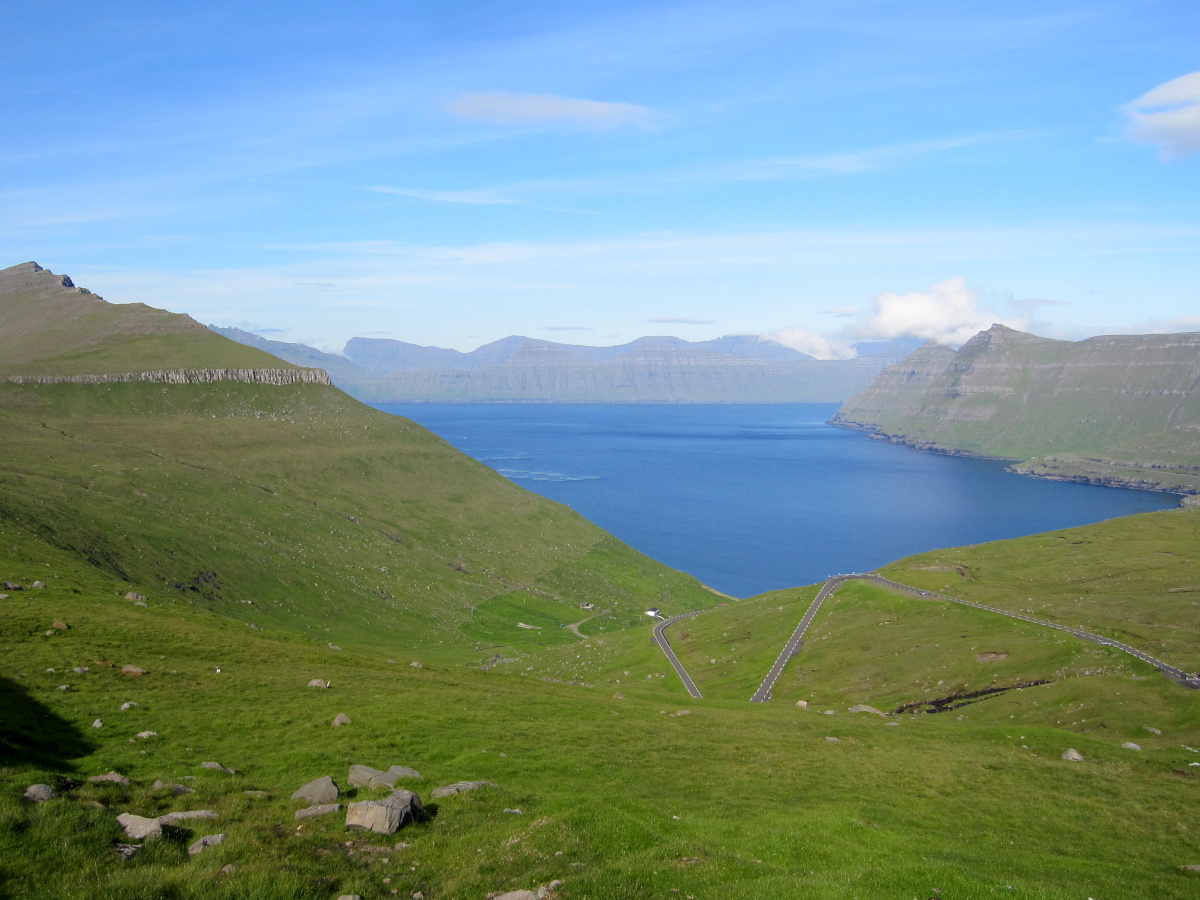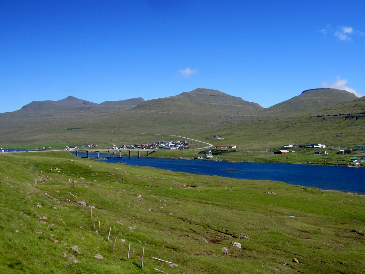 Bei Sonnenschein und immerhin 12 Grad fahre ich unter dem Atlantik hindurch auf die Hauptinsel Streymoy. Ich will so schnell wie möglich in den rauhen Norden, solange das Wetter noch so schön ist. An der Brücke zur Insel Eysturoy höre ich aber auf den Reiseführer und gebe mir noch die Sackgasse nach Tjørnuvík mit der grandiosen Aussicht auf Risin und Kellingin.