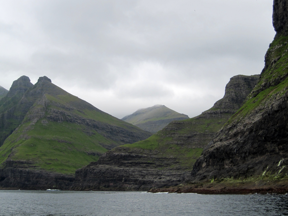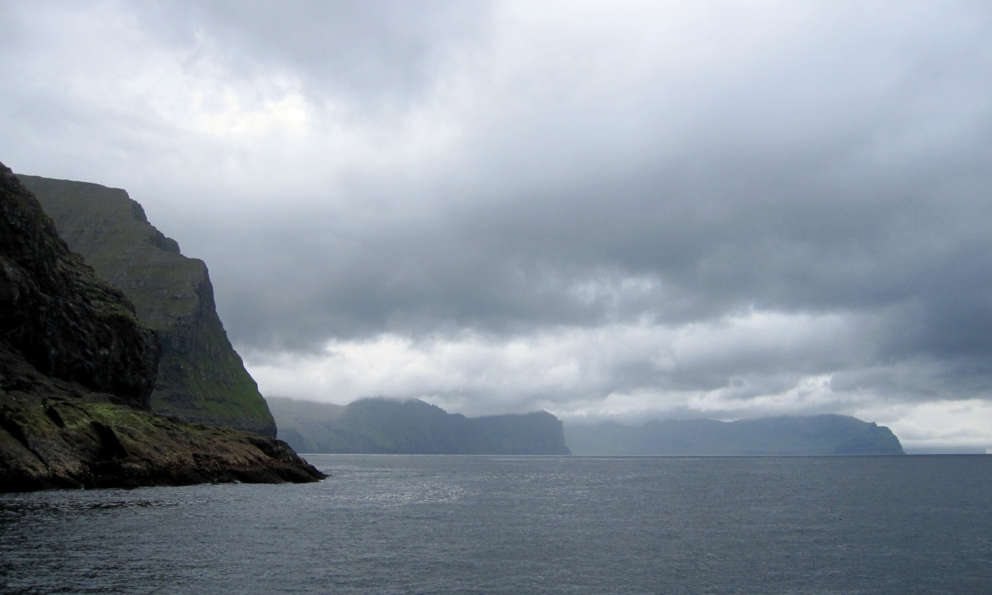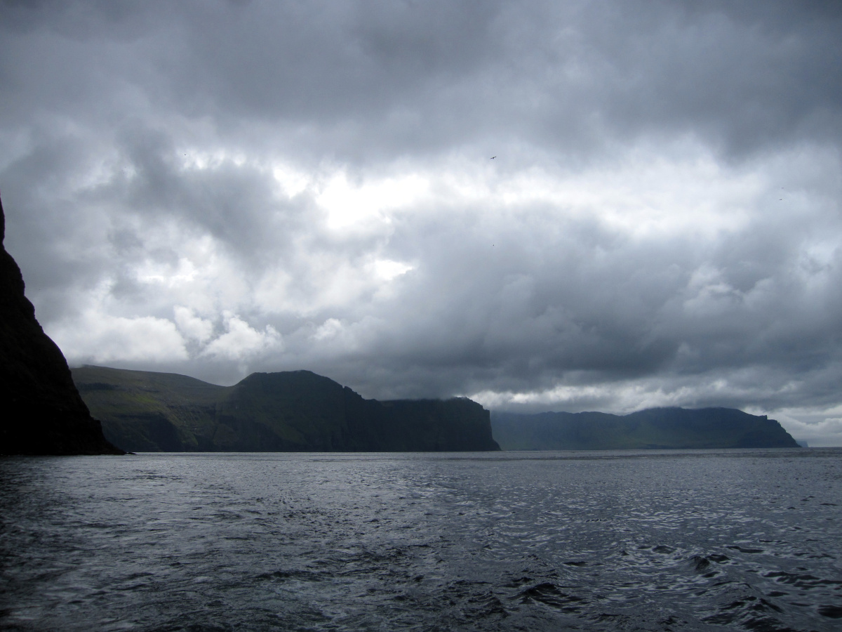 An meinem letzten Reisetag geht es wieder auf der Insel Streymoy nach Norden. Wie angekündigt ist es trübe und ich nehme die Hauptstraße mit dem Kollfjarðar-Tunnel. Kurz vor dem Vagar-Tunnel liegt das Dorf Leynar, hier besuche ich noch Finn, den ich im Flugzeug bei der Anreise kennengelernt habe. Er empfiehlt mir, noch die Vogelfelsen-Tour in Vestmanna mitzumachen und fährt mich mit seinem Auto dorthin. So schaffe ich es noch mit auf die letzte Bootstour des Tages.